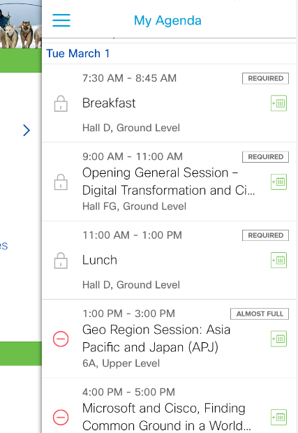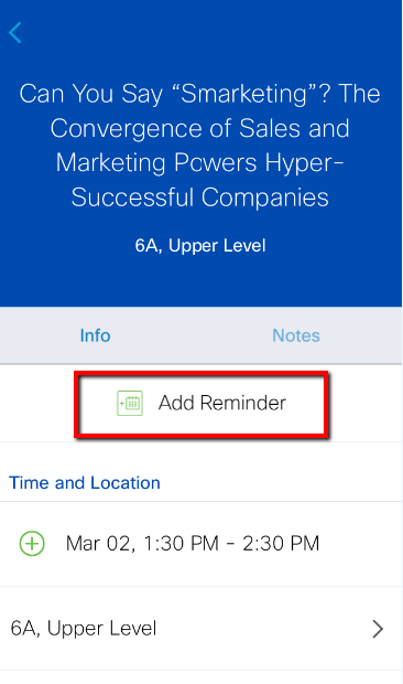 - Within session details you can add/remove the session, see session location, review session descriptions, speakers and key takeaways.